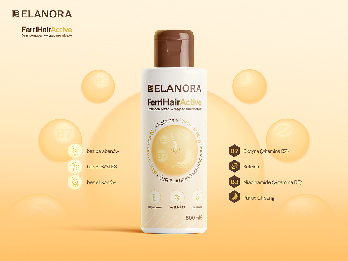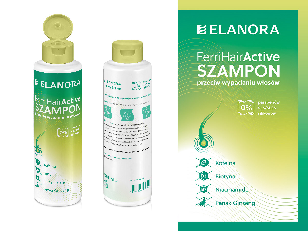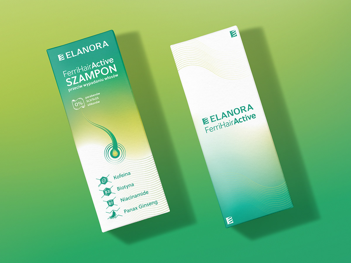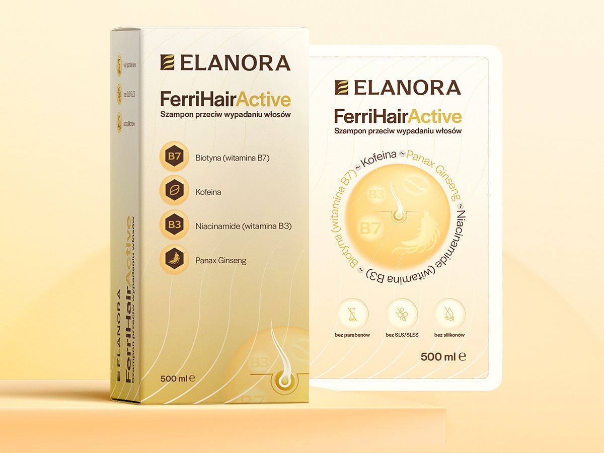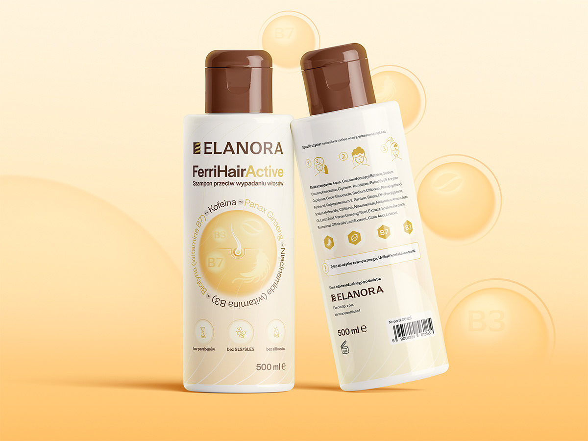 Packaging design for an anti-loss hair shampoo with clean typography and custom icons, including the brand logo for Elanora. The goal of this project was to design a clean and modern packaging concept for FerriHairActive's cosmetic shampoo.