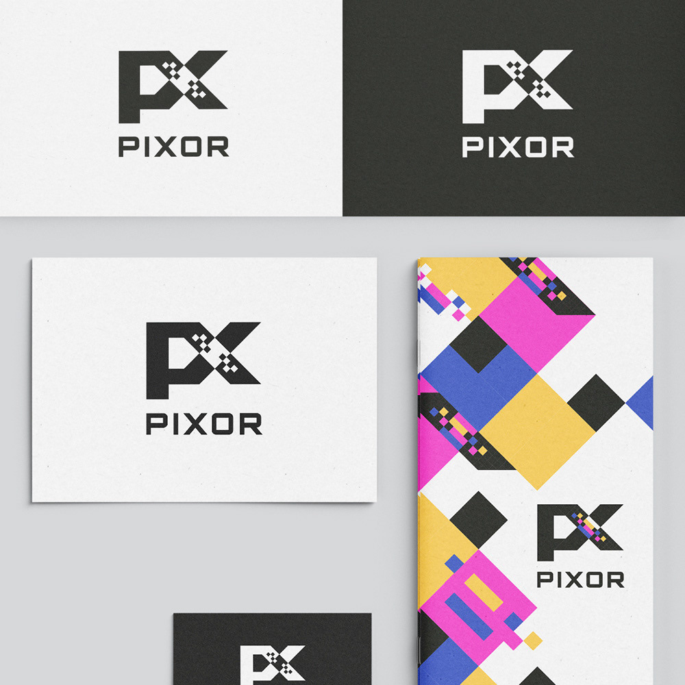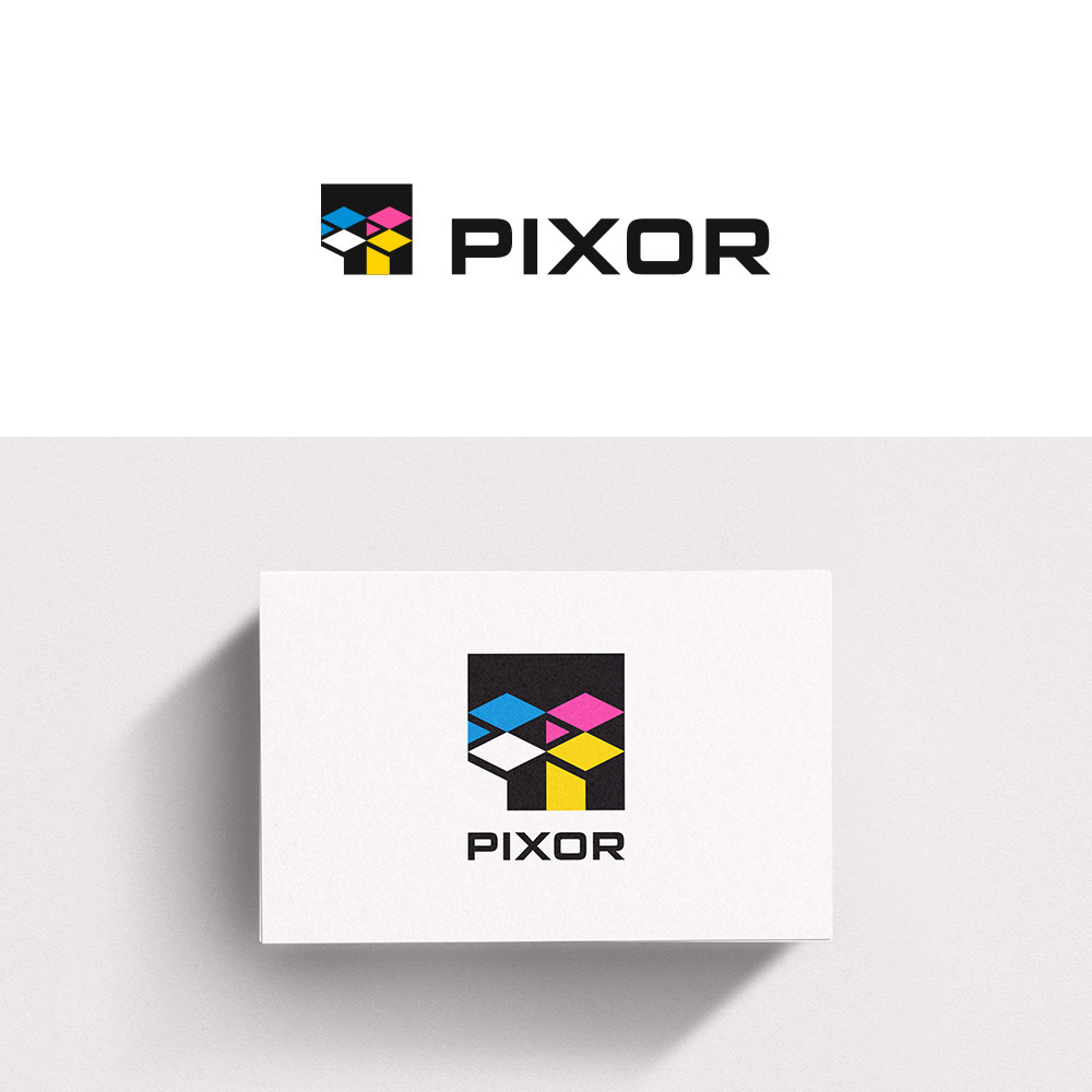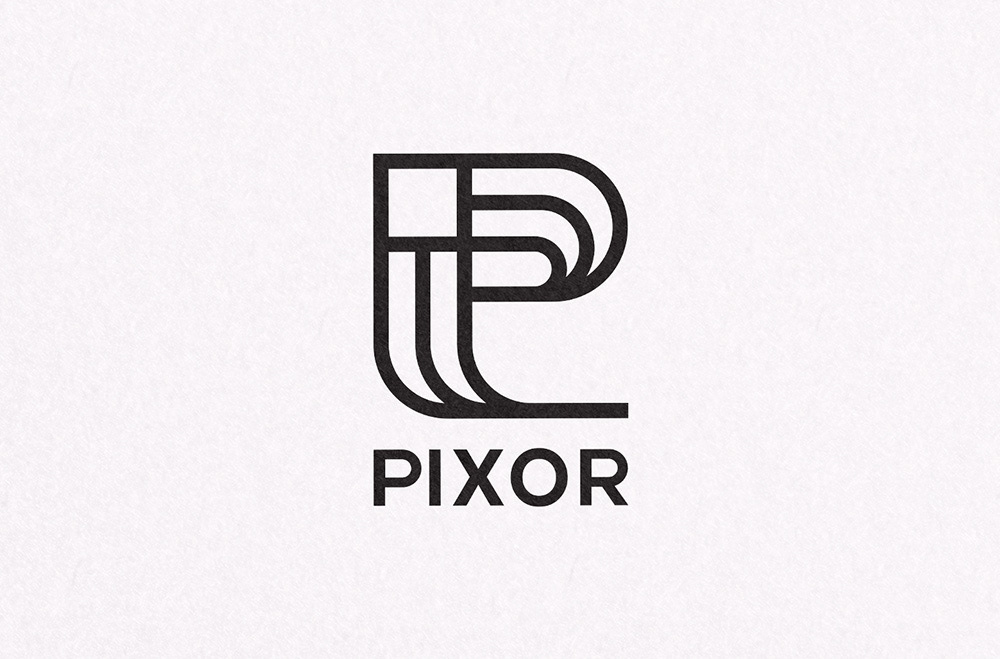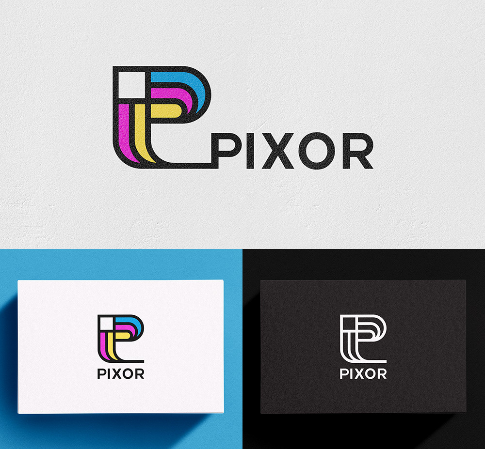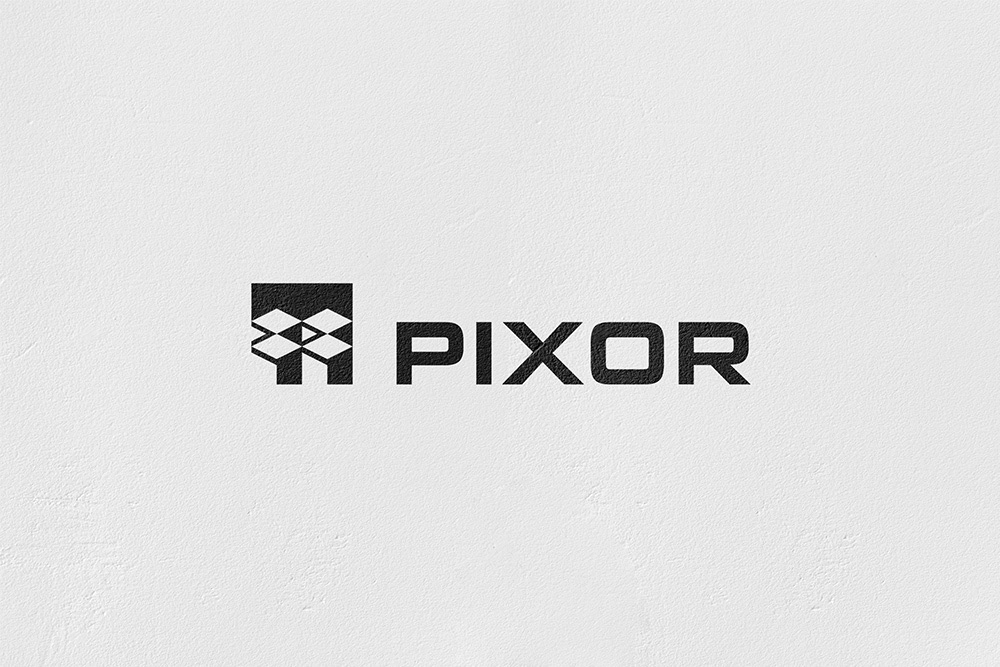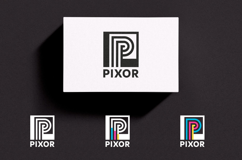 Logo designs for Pixor, a company offering direct printing on walls, floors, and other surfaces.
